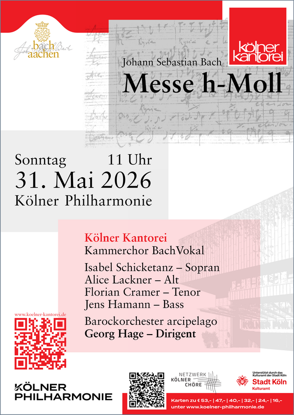 Johann Sebastian Bachs berühmte Messe h-Moll wurde anlässlich ihres Erstdrucks von ihrem Schweizer Verleger als „größtes musikalisches Kunstwerk aller Zeiten und Völker“ angekündigt und 2015 offiziell zum UNESCO-Weltdokumentenerbe erklärt. Kaum eine andere als diese epochale und berührende Komposition könnte das Zusammenwirken der beiden renommierten Konzertchöre Kölner Kantorei und BachVokal (Kammerchor des Aachener Bachvereins) gemeinsam mit dem Originalklang-Ensemble arcipelago unter Leitung von Georg Hage klangvoll begründen.